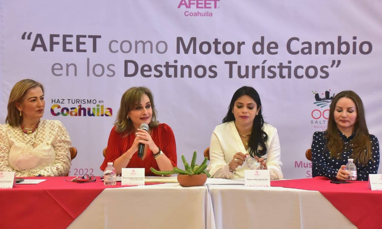 Por su parte, Dora Galindo señaló que en AFEET Coahuila están representadas directoras de recintos, de hoteles, agencias de viaje, tour operadoras, transportistas, academia, organismos de promoción turística, wedding planner, servidoras públicas y empresarias restauranteras, entre otras, «todas somos mujeres con una larga trayectoria profesional».
