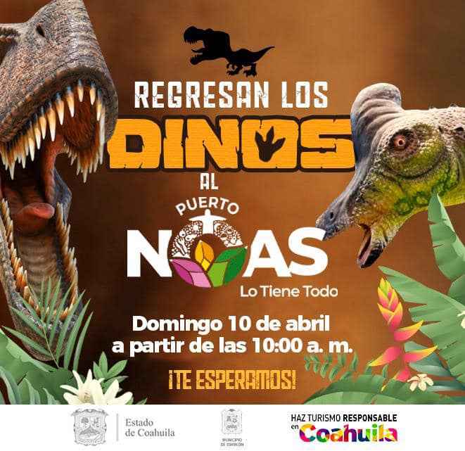 “El Gobierno del Estado De Coahuila y el municipio de Torreón te invitan estas vacaciones a visitar el Puerto Noas. La exposición de dinosaurios está de regreso, ¡ven con tu familia!”, publicaron en redes sociales.