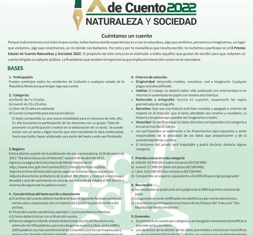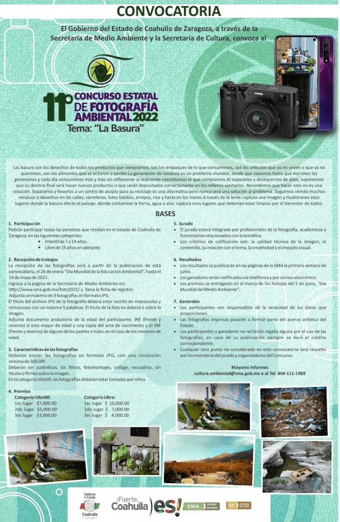 Saltillo, Coahuila de Zaragoza; a 20 de Abril de 2022.- Para alentar la participación de la sociedad en torno al respeto y el cuidado al medio ambiente, el Gobierno de Coahuila promueve diversos concursos literarios y de fotografía.