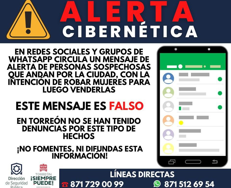 Exhortó a la población a evitar replicar este tipo de mensajes y a mantener la calma, pues en Torreón no se han registrado denuncias por este motivo. El comisario Perales aseguró que la Policía Municipal está pendiente a través de su personal operativo sobre cualquier situación oficial y registrada en sus sistemas, para tranquilidad de la ciudadanía.