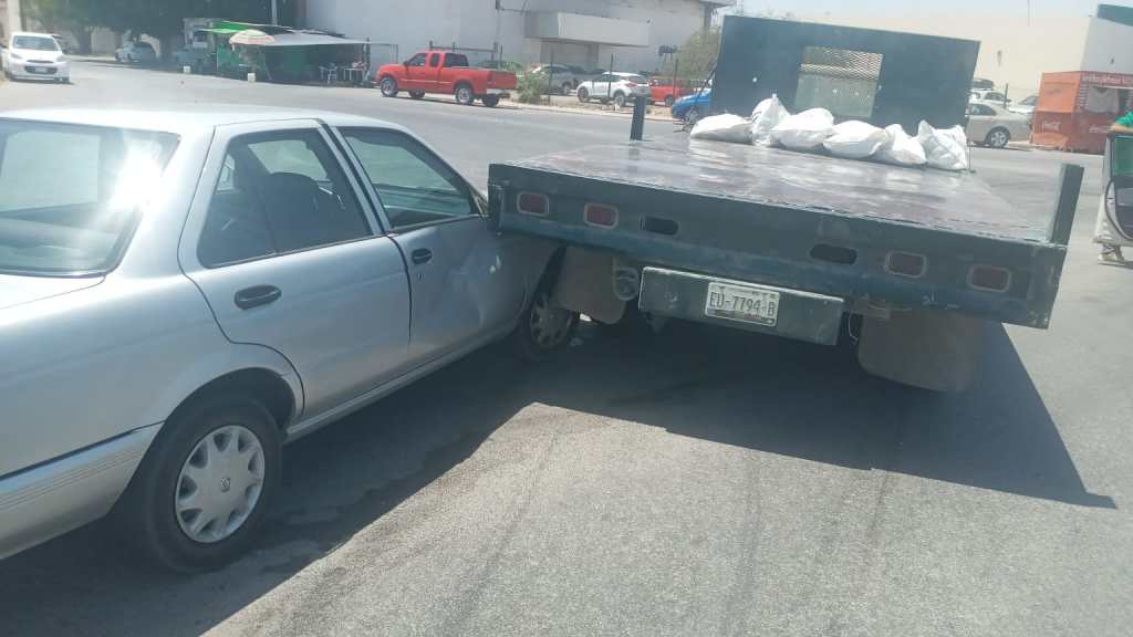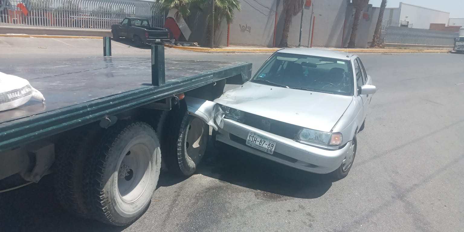Un vehículo de la maraca Nissan tsuru, con placas procedentes del vecino estado de Nuevo León, fue impactado en su parte lateral derecha por un camión de plataforma.