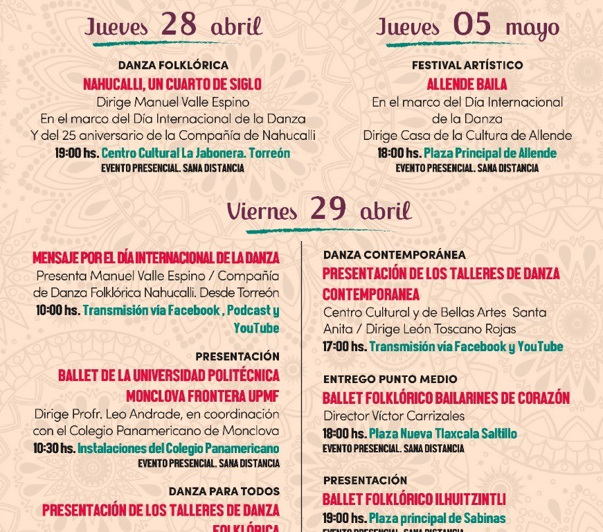Con este motivo, según lo dio a conocer la Secretaria de Cultura del Estado, Ana Sofía García Camil, la SC realiza una agenda especial de actividades culturales, iniciando el jueves 28 de abril con la presentación de danza folklórica “NAHUCALLI, UN CUARTO DE SIGLO”, dirigida por Manuel Valle Espino, también como parte del 25 Aniversario de la Compañía de Nahucalli, en el Centro Cultural La Jabonera, de la Ciudad de Torreón, a las 19:00 horas.