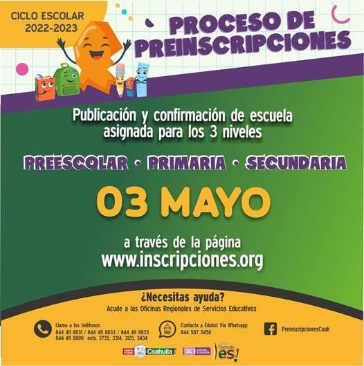 Saltillo, Coahuila de Zaragoza; a 03 de Mayo de 2022.- A partir del hoy 3 de mayo, los padres de familia de Coahuila podrán consultar los resultados del proceso de preinscripción que se realizó en el mes de febrero y que corresponde al Ciclo Escolar 2022-2023.