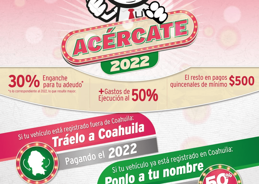 En el caso de que tu vehículo esté registrado fuera del Estado, ¡tráelo a Coahuila! y sólo paga el Ejercicio Fiscal 2022, se condona al 100 por ciento de ejercicios anteriores”, añadió el Administrador Fiscal del Estado.