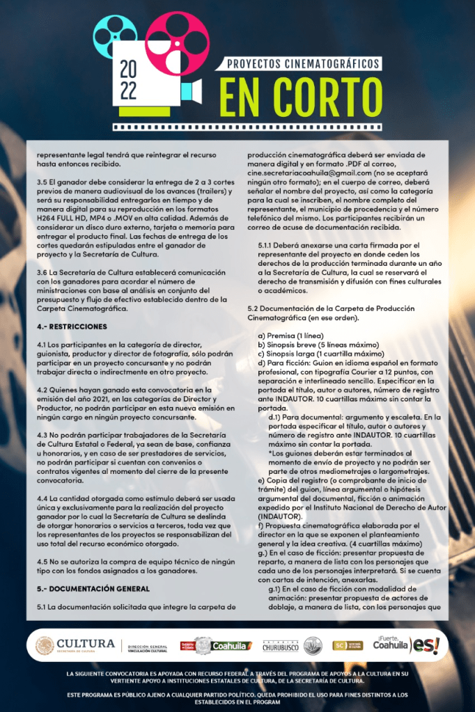 En esta convocatoria pueden participar todas las personas mayores de 18 años, coahuilenses por nacimiento o ciudadanos mexicanos que comprueben haber radicado de manera habitual y constante en el Estado durante los últimos 5 años, presentando una carpeta de proyecto cinematográfico de cortometraje en el género de Documental y/o Ficción, de acuerdo las bases de la convocatoria.