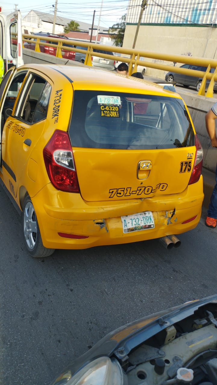 La primera unidad y más afectada fue un taxi quien era conducido por Jesús Gallegos, el cual al momento se encuentra herido, pero estable, sólo se espera el arribo de la Cruz Roja para que sea trasladado y atendido en el nosocomio de esta institución.