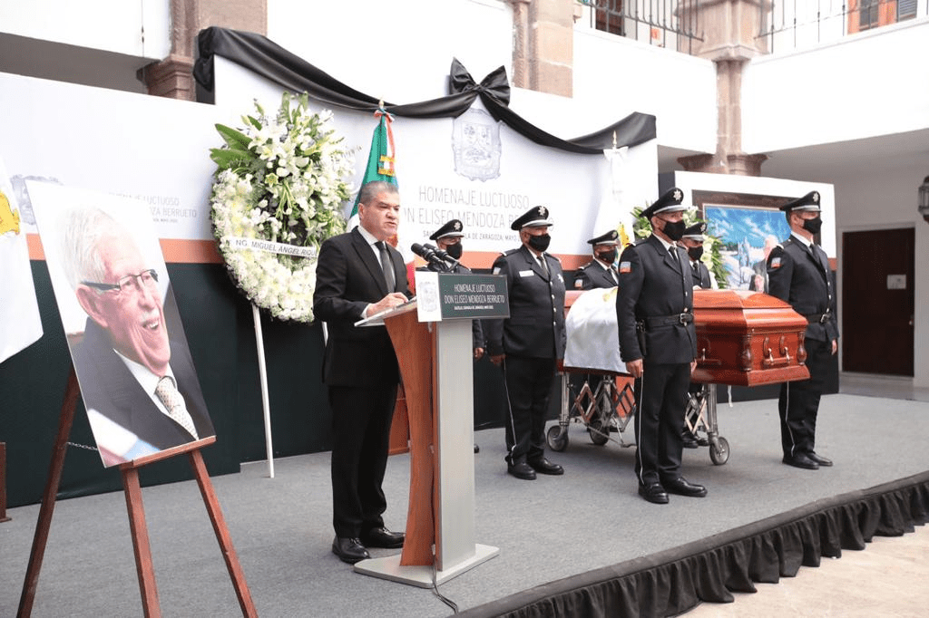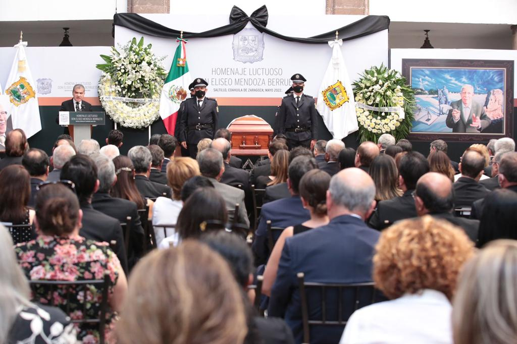“Hoy le damos un último adiós a don Eliseo Mendoza Berrueto, pero permanecerá el legado de su vida y su obra, así como el aprecio, la admiración y gratitud de miles de compatriotas y de las fraternales alianzas que forjó”, aseveró el Mandatario coahuilense.