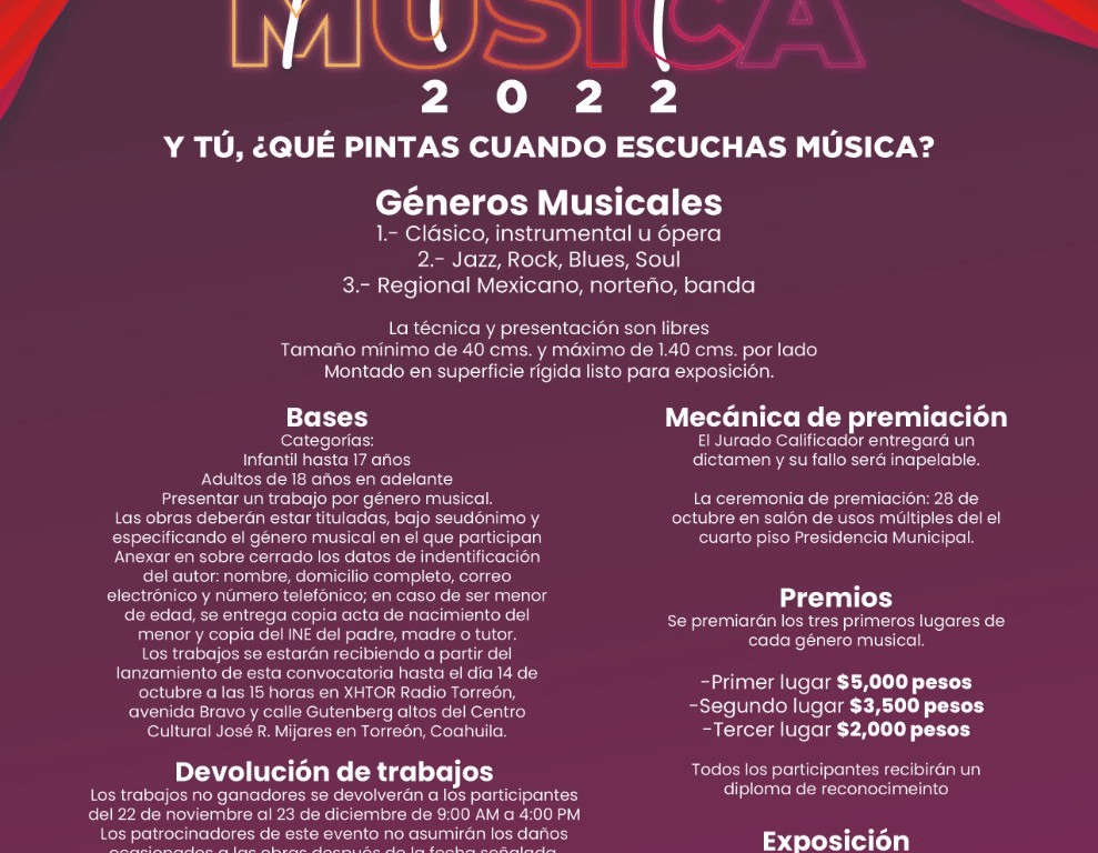 Torreón, Coahuila de Zaragoza; a 26 de Mayo de 2022.- El Ayuntamiento de Torreón, a través de Radio Torreón y el Instituto Municipal de Cultura y en coordinación con la Secretaría de Cultura de Coahuila, lanzaron el día de hoy la convocatoria «Pinta Tu Música», una iniciativa de Radio Torreón creada en 1997 con el objetivo principal de fomentar el desarrollo artístico de la comunidad lagunera, donde los y las participantes plasman su creatividad y sensibilidad a través de la fusión de las artes de la música y la pintura.