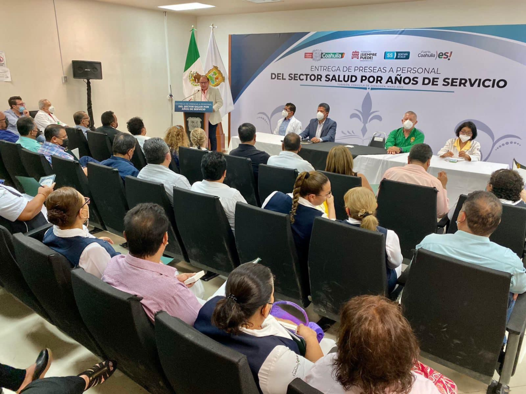“Entregamos este día preseas por 20, 25, 30, 35 y 50 años de servicios a médicos, personal de enfermería y de apoyo, así como a trabajadores administrativos de unidades de salud que pertenecen a los municipios de Torreón, Matamoros, San Pedro y Francisco I. Madero”, explicó Bernal Gómez.