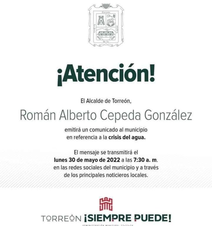 Torreón, Coahuila a 29 de mayo de 2022. – El alcalde de Torreón, Román Alberto Cepeda González, emitirá un comunicado a la ciudadanía este lunes 30 de mayo, en punto de las 07:30 a.m. con respecto a la crisis de agua que se ha estado viviendo en el municipio.
