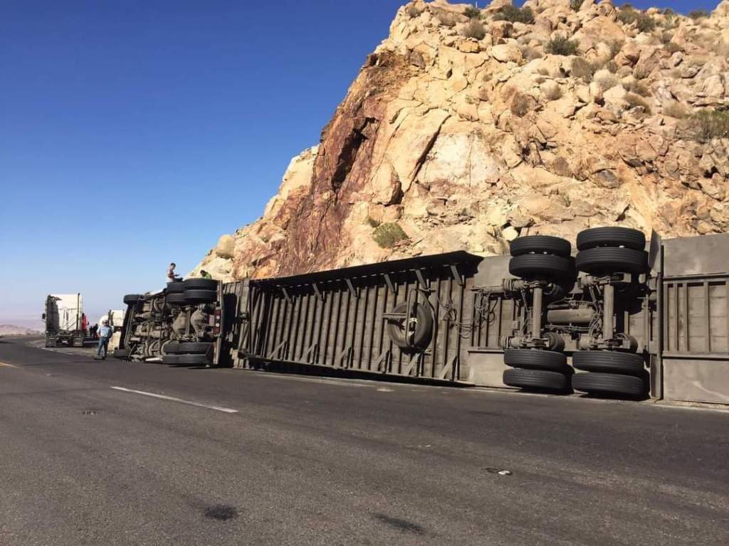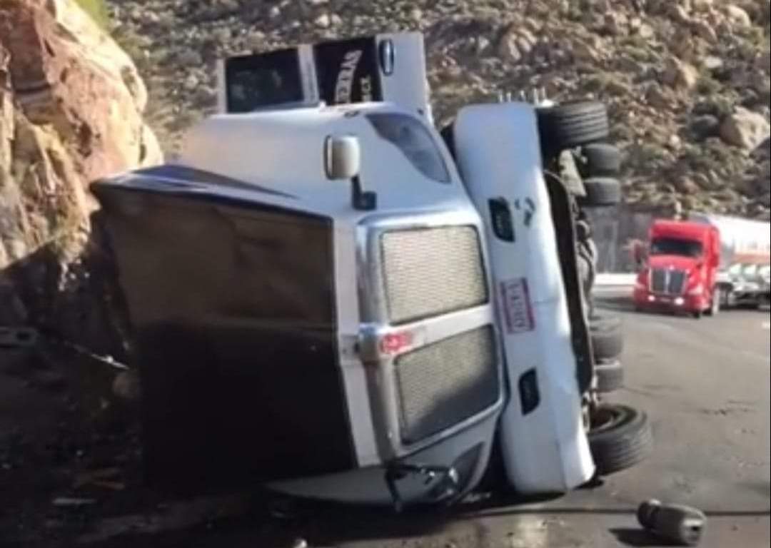 Un tráiler de la línea «tres guerras», que viajaba en exceso de velocidad se volcó sobre el asfalto,.