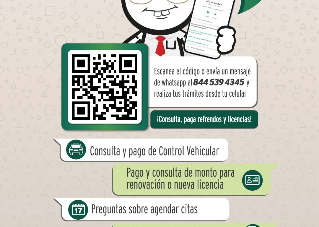 El Administrador Fiscal del Estado, Javier Díaz González, invitó a los contribuyentes coahuilenses a que ahorren tiempo y eviten filas al realizar sus trámites en línea, aprovechando la plataforma de WhatsApp de la AFG.