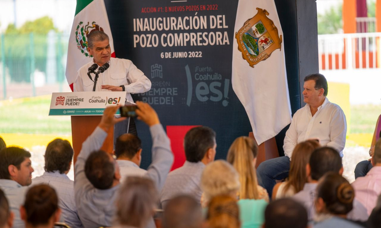 Torreón, Coahuila de Zaragoza; a 07 de Junio de 2022.- El gobernador Miguel Ángel Riquelme Solís inauguró el Pozo “Compresora” y estuvo acompañado por el Presidente Municipal, Román Cepeda González, que ha echado a andar la estrategia de ocho nuevos pozos más para Torreón, siendo este el primero del 2022.