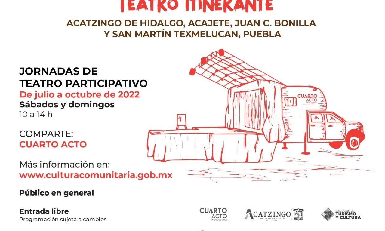 Ciudad de México a 16 de julio de 2022. – La Secretaría de Cultura del Gobierno de México, a través del programa Cultura Comunitaria, en colaboración con la compañía de teatro Cuarto Acto Producciones, pondrá en marcha el proyecto “Cultura Comunitaria Teatro Itinerante” con funciones y talleres de teatro participativo durante los sábados y domingos de julio a octubre de 2022 en los municipios de Acatzingo, Acajete, Juan C. Bonilla y San Martín Texmelucan, Puebla. La entrada es libre para todo público.