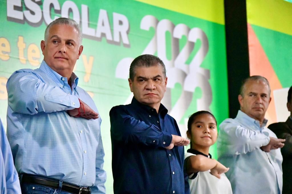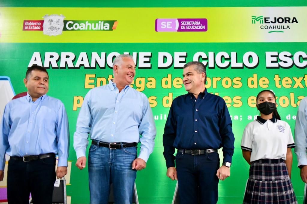 Torreón, Coahuila a15 de agosto de 2022.- En la Secundaria Técnica Número 1 de Torreón, el Gobernador del Estado, Miguel Ángel Riquelme Solís, arrancó el Ciclo Escolar 2022-2023, acompañado por el Alcalde Román Alberto Cepeda González, donde además se hizo entrega simbólica de paquetes de libros y útiles escolares a alumnos de Educación Básica.