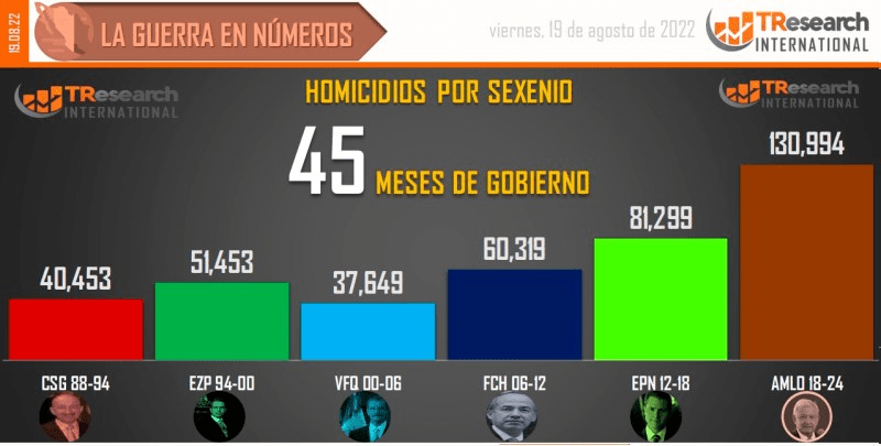 Haciendo la comparativa de las muertes en el mismo periodo en otros sexenios, el actual Gobierno encabeza el registro de dicho delito con 130 mil 994 incidentes, superior al de la Administración pasada, con Enrique Peña Nieto, que registró 81 mil 299.