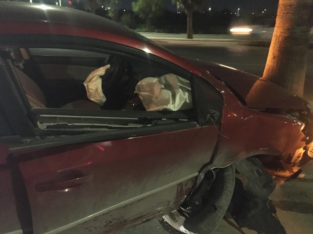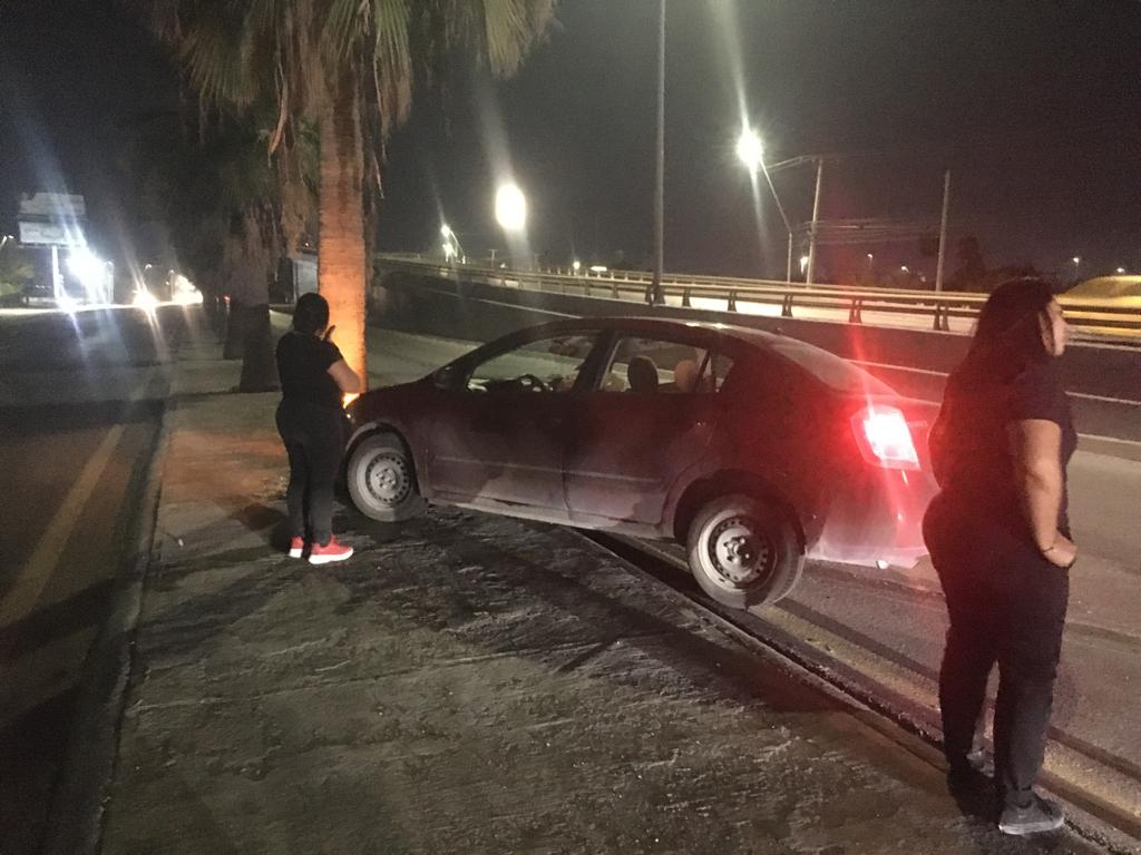 Torreón, Coah.- Hace unos momentos en el puente ubicado en la Carretera Torreón-Matamoros y Carretera Mieleras un Vehículo Sentra color rojo perdió el control y se impactó contra el muro de contención del mencionado puente, ocasionando que el mismo descontrol del coche llegara a detenerse contra una palmera instalada en el camellón central.