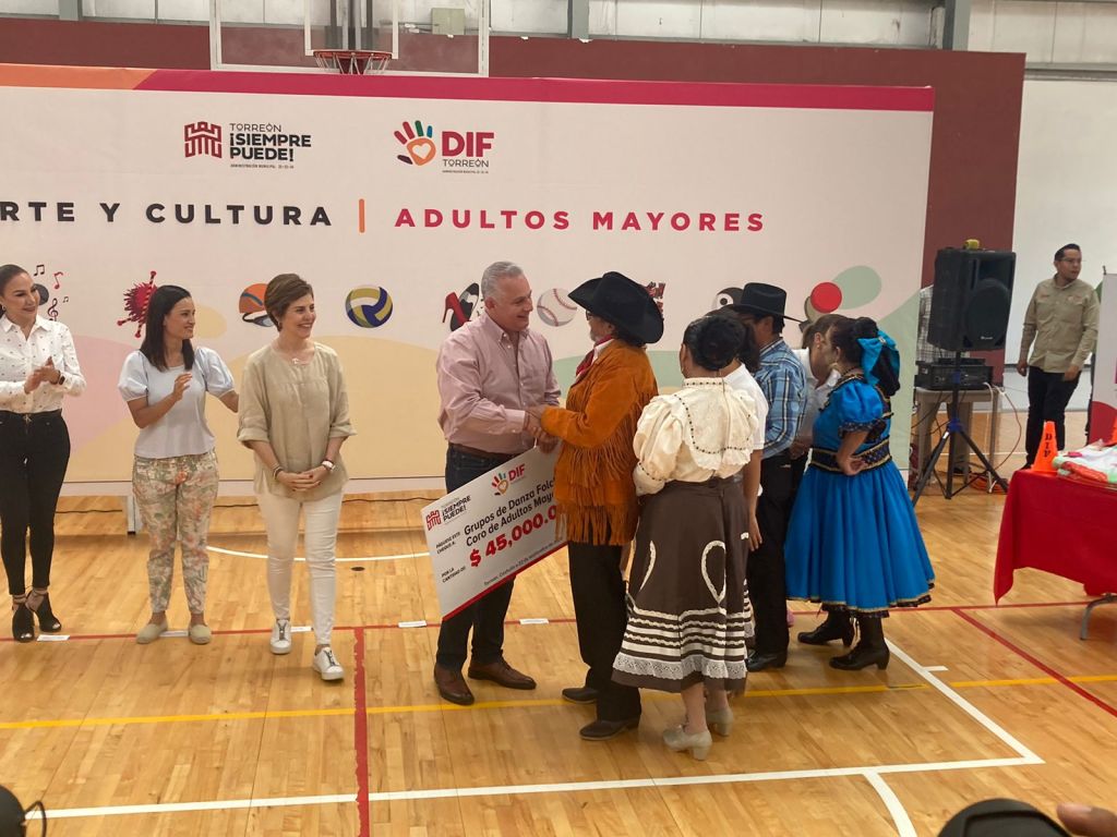 Donando así balones para la práctica de baloncesto, playeras, entre otros artículos deportivos y un cheque por la cantidad de 45 mil pesos a los grupos de danza folclórica y coro de adultos mayores.
