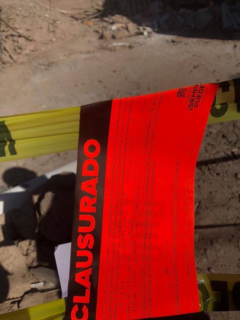 En atención a una denuncia ciudadana, personal de la Dirección de Inspección y Verificación Municipal de Torreón, colocó sellos de suspensión de actividades al inmueble ubicado en Corregidora y Juan E. García de la colonia Centro, donde se realizaban trabajos de demolición sin contar con los permisos correspondientes.