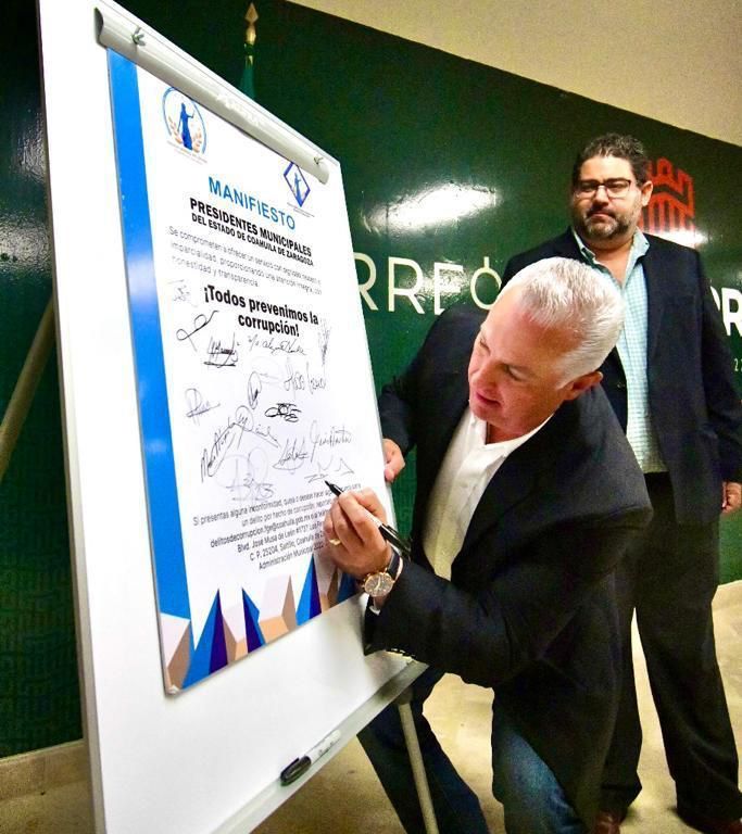 El Alcalde de Torreón, Román Alberto Cepeda González, y servidores públicos que integran la Administración Municipal, firmaron el manifiesto anticorrupción, que establece el compromiso de ofrecer a la ciudadanía atención íntegra, con honestidad y transparencia.
